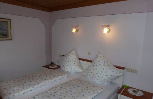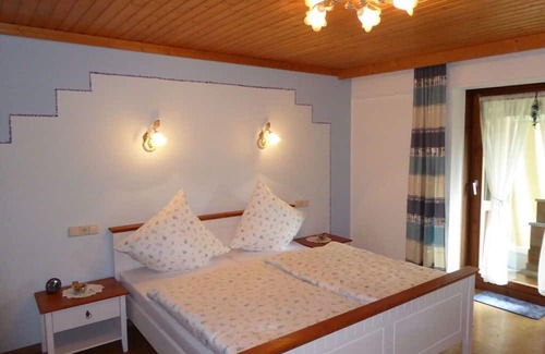 The large apartment with new equipment (2017) and view of the mountains is located on the 1st floor with southern balcony (11qm), Eastern Balkon (13qm). Grill facilities, play and lying area on the 5000 square meter property with pond. ++++ This apartment is also suitable for 2 friends. ++++ The apartment is 150 sqm and consists of living space = 24sqm, eating kitchen = 22qm, 4 bedrooms with double beds, bathroom/shower/toilet = 10sqm, additional separate shower/toilet for 2 bedrooms. 150 sqm fitness area with many training equipment and table tennis table, pool 4 x 2 m, 1.3 m deep with 2 sparkling and 2 massage jets, steam and Finnish sauna. In the basement there are 2 other holiday apartments with a level entrance.