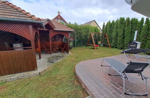 The holiday apartment is located in a single-family home, was renovated in 2021 and is furnished in a modern style. Also due to its quiet hillside location the domicile is popular. Available for shared use: sunbathing lawn, sun lounger, children's playground, swing, barbecue facilities, pavilion, garden furniture and courtyard.LocationBorgata. The holiday apartement is located on a 100 sqm open garden plot with meadow and flowers. The landlord does not live in the house or on the property. Access is via a side road (rubble or gravel). Parking (for 2 cars) is available on the property. Specialair conditioning, electric heating.Facilities: internet access (WLAN). TV reception takes place via satellite. Dogsallowed, EUR 5.00/pet per day. DistancesShopping 400 m, restaurant 400 m, town center 400 m. thermal bath in Borgata 400 m. Children's playground 400 m. In summer: Borgata 400 m in Borgata (beach 400 m in Borgata). Bükfürdő 43 km, Sárvár 18 km DivisionHoliday apartment, 1 floor, 3 rooms (including 2 bedrooms), 65 sqm, in total 4 beds. RoomThe entrance to your holiday apartment is located on the ground floor and leads over an external staircase directly into the living room. Living room with sitting area and TV. 2 bedrooms each with 1 double bed. Kitchen with dining area (4 seats), gas stove (4 flames), oven, extractor hood, fridge (120 l, icebox), microwave, coffee machine, toaster, electric kettle and access to the terrace (12 sqm, garden furniture, 2 sunbeds). Bathroom with shower, 1 washbasin, WC, hairdryer and window. Terms of lease and pricesIncluded in the priceinternet access, air conditioning, parking place, electricity, gas, water, final cleaning, bed linen, hand towels, Wireless Internet access. Side costs-Costs on the spot:/Obligatory:local tax by local tariff.Deposit:EUR 100,-/object