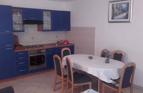 The holiday apartment is located in an apartment house and is furnished in a typical country style. The property is located in a residential area, on the outskirts. Also due to its quiet and sunny location the domicile is popular. Available for shared use: children's playground, swing, barbecue facilities, terrace and garden furniture. Washing machine on request. Children trampoline.LocationLopar. The holiday apartement is located on a 1200 sqm open garden plot with meadow, flowers and shrubs. The landlord lives permanently in the house, but uses a seperate entrance. The holiday apartments RAB LOP 054 (4 persons), RAB LOP 055 (11 persons), RAB LOP 056 (4 persons) and RAB LOP 057 (8 persons) are in the same house. Access is via a side road (asphalted). Parking (for 6 cars) is available on the property. Specialair conditioning.Facilities: internet access (WLAN). TV reception takes place via satellite. Dogsnot allowed. DistancesShopping 100 m, restaurant 100 m, town center 400 m. Lopar: pharmacy 150 m and doctor 60 m. Children's playground 100 m. Rab 12 km away. In summer: Adriatic Sea 600 m in Lopar (beach 600 m in Lopar featuring sand). tennis, mini golf each 600 m in Lopar. DivisionHoliday apartment, 1 floor, 4 rooms (including 3 bedrooms), 60 sqm, in total 7 beds (including 1 additional bed). RoomThe entrance to your holiday apartment is located on the 2nd floor and leads over an external staircase directly into the vestibule. 3 bedrooms each with 1 double bed. Living/bedroom (walk-through room) with 1 additional bed on couch/sofa (only suitable under the year of 11), TV, dining area and access to the balcony (8 sqm, covered, garden furniture). Cooking nook in the living & bedroom with electric stove (4 plates), oven, extractor hood, dishwasher, fridge, microwave, coffee machine and electric kettle. Bathroom with bathtub, 1 washbasin and WC. 2 bathrooms each with shower, 1 washbasin, WC and hairdryer. Terms of lease and pricesIncluded in the priceinternet access, air conditioning, parking place, electricity, water, final cleaning, bed linen, Wireless Internet access. Side costs-Additionally(Payable when booking)/local tax.Costs on the spot:/On request:washing machine 5 € per stage of washing programme based on usage.Deposit:EUR 100,-/object
