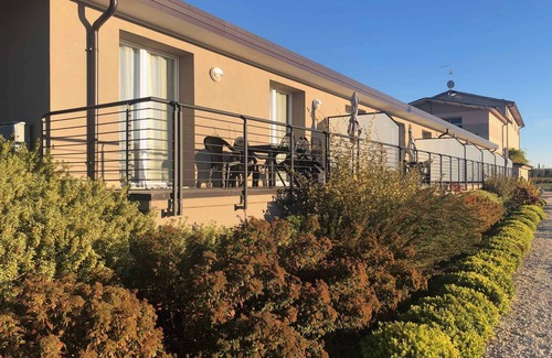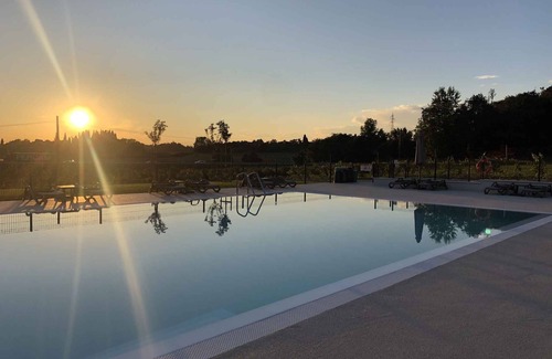 The holiday apartment built in 1980, was renovated in 2020 and is furnished in a modern style. The property is located in a hotel complex, on the outskirts. Also due to the view over a panorama from the property and its quiet and sunny location the domicile is popular. Available for use: sunbathing lawn, parasol, sun lounger and garden furniture.Holiday resort12 accommodations, 60 beds, lobby, reception and laundry. All common rooms are air-conditioned. LocationLazise, district Colà, 130 m above sea level. The holiday apartement is located in a hotel complex, on a open plot with meadow, flowers and trees. Access is via a side road (asphalted). Parking is available on the property. Specialair conditioning, electric heating.Facilities: high chair, internet access (WLAN) and safe. TV reception takes place via satellite. PoolAll pools are available for shared use. Outdoor pool (usable from mid April to end of September, infinity-pool, 8 m x 15 m, depth 1.40 m). Dogsallowed, EUR 7.00/pet per day. DistancesShopping 1,8 km, restaurant 200 m, town center 1200 m. thermal bath in Colà 1000 m. pharmacy in Pacengo 4 km. railway station in Peschiera del Garda 8 km. airport in Villafranca 22 km. Children's playground 1000 m. In summer: Bathing possibility 4 km in Lazise (beach 4 km in Lazise featuring gravel and stones). dog beach in Peschiera del Garda 11 km. DivisionHoliday apartment, 1 floor, 3 rooms (including 2 bedrooms), 50 sqm, in total 6 beds (including 1 cot). RoomThe entrance to your holiday apartment is located on the ground floor, is at ground level and leads directly into the kitchen-diner with doors to all rooms. Bedroom with 1 double bed, 1 single bed and 1 cot. Bedroom with 1 double bed. Eat-in kitchen with TV, dining area (4 seats) and access to the balcony (17 sqm, garden furniture, 1 table, 6 chairs, together with eat-in kitchen). Kitchen in the kitchen-diner (18 sqm) with TV, dining area (6 seats), electric stove (ceramic hob, 4 plates), extractor hood, fridge (icebox), microwave, coffee machine, toaster and access to the balcony. Bathroom (6 sqm) with shower, 1 washbasin, WC, bidet and window. Credit cardsVisa, MasterCard. Terms of lease and pricesIncluded in the priceOutdoor pool, air conditioning, parking place, electricity, water, local tax (under 14 years), bed linen (first usage), hand towels (first usage), Wireless Internet access. Side costs-Costs on the spot:/Obligatory:final cleaning 55 € per object per stay. local tax by local tariff (if charged).On request:bed linen 7 € per person per change. parking place (additionally) 7 € per car per day. Towels (please order at booking) 8 € per person per change. Breakfast - please order at booking 13 € per person per day. high chair - please order at booking 7 € per piece under 3 years per day. baby cot (please order at booking) 7 € per bed under 3 years per day. parking place for boat trailer (please order at booking) 9 € per piece per day.Deposit:EUR 150,-/object