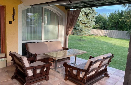 The holiday apartment is located in a single-family home built in 1991, was renovated in 2022 and is furnished in a modern style. The property is located in a residential area, in the town centre. Also due to its quiet and sunny location the domicile is popular. Available for shared use: sunbathing lawn, sun lounger, children's playground, swing, barbecue facilities, terrace, garden furniture and courtyard.LocationBalatonberény. The holiday apartement is located on a 1480 sqm enclosed garden plot with meadow, flowers and shrubs, bordered by a fence. The landlord lives in a separate building on the property. Access is via a side road (asphalted). Parking (for 5 cars) is available on the property. Specialair conditioning.Facilities: children's toys, high chair, internet access (WLAN), iron, ironing board, washing machine and dryer. TV reception takes place via satellite. PoolAll pools are available for shared use. Outdoor pool (usable from early June to early September, diameter 3,6 m, depth 0,96 m)., Dogsnot allowed. DistancesShopping 150 m, restaurant 150 m, town center 150 m. For a relaxing holiday, a car is not necessary. thermal bath in Héviz 15 km. In summer: Balaton 200 m in Balatonberény (nudist beach 500 m in Balatonberény featuring meadow). fishing in Balatonberény 200 m. DivisionHoliday apartment, 1 floor, 4 rooms (including 3 bedrooms), 120 sqm, in total 5 beds. RoomThe entrance to your holiday apartment is located on the ground floor and leads over the 16 sqm terrace directly into the living room with doors to all rooms. Living room with sitting area, TV and access to the terrace (16 sqm, covered, garden furniture, 1 table, 6 chairs). Bedroom with 1 single bed. 2 bedrooms each with 1 double bed. Kitchen with dining area (5 seats), electric stove, dishwasher, fridge (icebox), microwave, coffee machine and electric kettle. Bathroom with shower, 1 washbasin and window. Separate toilet with WC and window. Terms of lease and pricesIncluded in the priceOutdoor pool, internet access, dish towels, air conditioning, parking place, laundry dryer, washing machine, electricity, gas, water, final cleaning, bed linen, pool, bathing towels, sunloungers, bicycle parking, Wireless Internet access. Side costs-Costs on the spot:/Obligatory:local tax by local tariff.Deposit:EUR 100,-/object