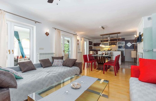 The holiday apartment is located in a standig individually detached house, built in 2008, renovated in 2016 and is modern furnished. The property is located on the outskirts. The domicile is also popular because of the view over woods from the property and the sunny location. For use are available: sunbathing area, parasol, sun lounger, garden shower, grill possibility, terrace, garden furniture, fire place and court.LocationKaldanija, 180 m above sea level. The holiday apartement is located on a 600 sqm, closed garden plot with meadow and flowers, limited by a fence and a hedce. The landlord lives permanently in the house, but uses a seperate entrance. The access goes directly from the main road (asphalted). Parking lot (for 3 cars) on the property. Specialair conditioner, central heating (oil). Facilities: cot, high chair, internet access (WLAN) and washing machine. TV reception takes place via satellite. PoolOutdoor pool (heatable, 3 m x 8 m, depth 1,45 m, for exclusive use). The pool facility can be used from the beginning of April to mid of October. Pool heating is included in the price available in June, July and August. For months April, May, September and October, the pool heating costs € 7.00 per day. Dogsallowed, EUR 5.00/pet per day. DistancesShopping opportunity 3 km, restaurant 200 m, town center 3,5 km. doctor, pharmacy, bank each 9 km in Caldania.In summer: Adriatic Sea 6 km in Caldania (nudist beach 6 km in Caldania with meadow, gravel and stones). Caldania: golf 8 km and tennis, boat rental, boat launch each 9 km. DivisionHoliday apartment, 1 floor, 4 rooms (including 3 bed rooms), 160 sqm, in total 7 beds (including 1 additional bed). RoomThe entrance in your holiday apartment is located on the ground floor, is covered and at ground level and leads directly in the hallway with wardrobe and doors to all rooms. Living room (35 sqm) with sitting area, TV and dining area. Bedroom (15 sqm) with 1 double bed, 1 additional bed on couch/sofa, 1 crib and safe. 2 bedrooms each (14 sqm) with 1 double bed. American kitchen in the living room with TV, electric stove (ceramic hob, 4 plates), oven, extractor hood, dishwasher, fridge (180 l, icebox), microwave, coffee machine, toaster, electric kettle and washing machine. Bathroom (3 sqm) with shower, 1 sink and WC. Bathroom (7 sqm) with whirlpool, 2 sinks, WC, bidet, hairdryer and window. Terms of lease and pricesIncluded in the priceOutdoor pool, babycot, internet access, air conditioning, parking place, electricity, gas, water, pool, sunloungers, Bed linen (weekly change), baby cot – please order at booking, Wireless Internet access. Side costs-Additionally(Payable when booking)/local tax.Costs on the spot:/Obligatory:final cleaning 150 € per object per stay.Deposit:EUR 300,-/object.