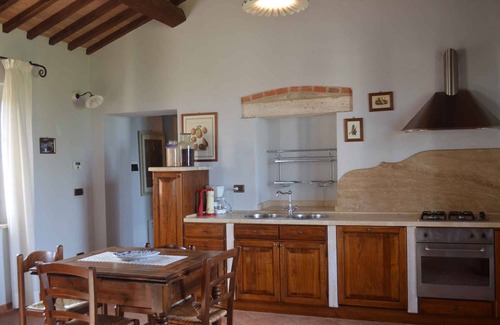 4 stars, 4 accommodations, 17 beds and internet (WLAN). LocationAsciano. The holiday apartement is located on a farm, on a enclosed garden plot with meadow, flowers and trees. The apartment is very well furnished, with beamed ceilings and terracotta floors. La casa è situata su una collina nel bellissimo scenario delle Crete Senesi. Si tratta di un punto di partenza ideal per passeggiate e gite in bicicletta. Access is via a side road or via a field or forest track (rubble or gravel, length 2000 m). Parking (for 4 cars) is available on the property. Specialcentral heating (gas). da pagare sul posto al giornoFacilities: baby cot, high chair, internet access (WLAN), iron and washing machine. TV reception takes place via antenna.For your safety, the accommodation is equipped with CO2 detector, smoke detector, fire extinguisher and first aid kid. PoolAll pools are available for shared use. Outdoor pool (usable from early May to end of September, 6 m x 12 m, depth 1.9 m). Dogsallowed, EUR 40.00/pet per stay. DistancesShopping 3 km, restaurant 3 km, town center 4 km. railway station, doctor, pharmacy, bank each 5 km in Asciano. airport in Firenze 80 km. discotheque in moteriggioni 50 km. thermal bath in rapolano terme 12 km. cinema in sinalunga 15 km. Main road 2 km. Children's playground 5 km. Bank 3 km. Siena 25 km, Montalcino 30 km, Pienza 20 km away. Airports: Florence 90 km, Pisa 150 km Rome 180 km away. In summer: Bathing possibility (beach 100 km in Grosseto). tennis in Asciano 5 km. golf in Foiano della Chiana 15 km. DivisionHoliday apartment, 1 floor, 2 rooms (including 1 bedroom), 50 sqm, in total 4 beds (including 2 additional beds). RoomThe entrance to your holiday apartment is located on the 1st floor