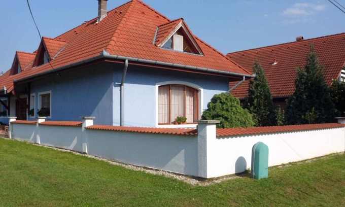 The holiday apartment is located in a single-family home built in 1998, was renovated in 2020 and is furnished in a modern style. The property is located in a residential area, in the town centre. Also due to its quiet and sunny location the domicile is popular. Available for shared use: sunbathing lawn, parasol, sun lounger, children's playground, sandpit, barbecue facilities, terrace and garden furniture. Hammock. Barbecue and children's playground are available for shared useLocationBalatonberény. The holiday apartement is located on a 702 sqm enclosed garden plot with meadow, flowers and shrubs, bordered by a fence. The landlord does not live in the house or on the property. The holiday home BAL BER 019 (4 + 1 persons) and BALBER115 (6 + 1P) are located on the property. The holiday property can only be booked by families. Access is via a side road (asphalted). Parking (for 4 cars) is available on the property. Specialair conditioning.Facilities: baby cot and internet access (WLAN). TV reception takes place via electric wire. Transmitter in Hungarian, German and English. PoolAll pools are available for shared use. Outdoor pool (usable from mid June to end of August, diameter 3,66 m, depth 1 m). Leisure2 bicycles and table tennis. Dogsnot allowed. DistancesShopping 150 m, restaurant 200 m, town center 200 m. In summer: Balaton 300 m in Balatonbereny. DivisionHoliday apartment, 1 floor, 3 rooms (including 2 bedrooms), 110 sqm, in total 5 beds (including 1 additional bed), on request additionally 1 child up to 2 years in a baby cot. RoomThe entrance to your holiday apartment is located on the ground floor and leads over the 30 sqm terrace. 2 bedrooms each with 1 double bed. Living/bedroom with 2 additional beds on double sofa bed, sitting area, TV, fireplace and access to the terrace (30 sqm, garden furniture, 1 table, 6 chairs). American kitchen with gas stove (4 flames), oven, extractor hood, dishwasher, fridge (icebox), microwave, coffee machine, toaster, electric kettle and Capsule coffee maker. Bathroom with bathtub with shower facility, shower, 1 washbasin, WC and window. Terms of lease and pricesIncluded in the priceOutdoor pool, babycot, internet access, baby cot, bicycle, parking place, electricity, gas, water, heating, final cleaning, bed linen, Welcome drink, pool, sunloungers, Wireless Internet access. Side costs-Costs on the spot:/Obligatory:local tax by local tariff.On request:air conditioning 10 € per object per day.Deposit:EUR 100,-/object
