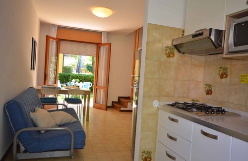 The holiday apartment is located in a terraced house and is furnished in a functional style. The property is located in a residence. Also due to its quiet location the domicile is popular.Holiday resort20 accommodations and internet (WLAN). LocationBibione, district Spiaggia. The holiday apartement is located in a residence, on a enclosed garden plot. Parking (for 1 car) is available on the property. Specialair conditioning, central heating.Facilities: safe. TV reception takes place via satellite.For your safety, the accommodation is equipped with CO2 detector and fire extinguisher. PoolAll pools are available for shared use. Outdoor pool (usable from mid May to mid September). Dogsallowed, EUR 40.00/pet per stay. DistancesShopping 450 m, restaurant 550 m, town center 500 m. thermal bath in Bibione 1,7 km. In summer: Adriatic Sea 1200 m in Bibione (beach 1200 m in Bibione featuring sand). Free beach shuttle DivisionHoliday apartment, 2 floors, 3 rooms (including 2 bedrooms), 55 sqm, in total 6 beds (including 2 additional beds), on request additionally 1 child up to 2 years in a baby cot. Room Bedroom with 2 single beds, 1 baby cot and Baby cot on request for a fee. Bedroom with 2 single beds. Living/bedroom with 2 additional beds on couch/sofa, TV and Access to the garden. Cooking nook in the living & bedroom with microwave and coffee machine. 2 bathrooms each with shower, 1 washbasin and WC. Terms of lease and pricesIncluded in the priceOutdoor pool, air conditioning, parking place, electricity, gas, water, heating, final cleaning, beach service (1 sunlounger, 1 chair, 1 parasol), Wireless Internet access. Side costs-Costs on the spot:/Obligatory:final cleaning of the kitchen to be carried out individually. local tax by local tariff (if charged).On request:bed linen 11 € per person per first time use and changing. hand towels 10 € per person per first time use and changing. baby cot – please order at booking 5 € per bed per day. high chair - please order at booking 3 € per piece per day. buggy 3 € per piece per day.Deposit:EUR 100,-/object
