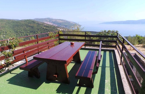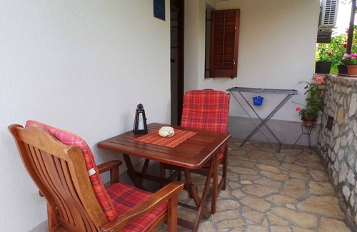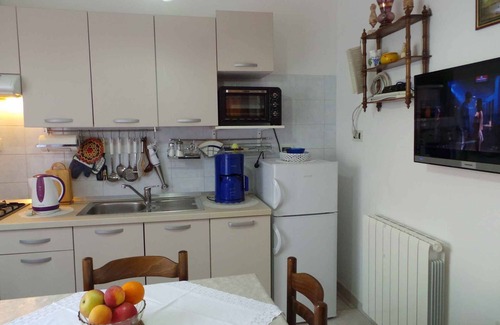 2 stars. LocationSveta Marina, 162 m above sea level. The holiday apartement is located on a farm, on a 2500 sqm enclosed garden plot with flowers, shrubs and trees, bordered by a fence and a hedce. The landlord lives permanently in the house, but uses a seperate entrance. Access is directly from the main road (asphalted). Parking (for 2 cars) is available on the property. Specialair conditioning, central heating (oil).Facilities: internet access (WLAN) and washing machine. TV reception takes place via satellite. Dogsnot allowed. DistancesShopping 1500 m, restaurant 1500 m, town center 1500 m. Labin: cinema 6 km and doctor, pharmacy, bank each 8,5 km. airport in Pula 42 km. discotheque in Rabac 13 km. railway station in Rijeka 65 km. In summer: Adriatic Sea 400 m in Bucht Prtlog (beach 400 m in Bucht Prtlog featuring sand, gravel, stones and rocks). horse riding in Labin 5 km. tennis, mini golf each 10 km in Rabac. diving in Scuba Center Sveta Marina 1,6 km. boat rental, boat launch each 1,6 km in Sveta Marina. DivisionHoliday apartment, 1 floor, 2 rooms (including 1 bedroom), 27 sqm, in total 2 beds. RoomThe entrance to your holiday apartment is located on the ground floor, is at ground level and leads over the 30 sqm terrace directly into the kitchen-diner. Bedroom with 1 double bed. Eat-in kitchen (walk-through room) with sitting area, TV, dining area (4 seats) and access to the terrace (6 sqm, covered, garden furniture, 1 table, 2 chairs, 2 sunbeds, Hollywood swing, parasol). Cooking nook in the kitchen-diner (walk-through room) with TV, dining area (4 seats), gas stove (2 flames), oven, extractor hood, fridge (110 l, icebox), coffee machine, electric kettle and access to the terrace. Bathroom with washing machine, shower, 1 washbasin, WC, hairdryer and window. Terms of lease and pricesIncluded in the priceinternet access, air conditioning, parking place, electricity, gas, water, final cleaning, bed linen, hand towels, sunloungers, Wireless Internet access. Side costs-Costs on the spot:/Obligatory:local tax by local tariff.Deposit:No deposit.