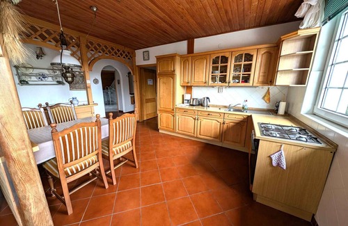 The holiday apartment is located in an apartment house and is furnished in a rustic and typical country style. The property is located on the outskirts. Also due to its quiet and secluded location the domicile is popular. Available for shared use: parasol, sun lounger, children's playground, sandpit, barbecue facilities and garden furniture.LocationKehidakustány. The holiday apartement is located on a 1500 sqm enclosed garden plot with meadow, flowers, shrubs and trees, bordered by a fence. The landlord does not live in the house or on the property. Access is via a side road (asphalted). Parking (for 1 car) is available on the property. Specialair conditioning.Facilities: baby cot, high chair, internet access (WLAN), iron, ironing board and washing machine. TV reception takes place via satellite. Shipments in German.For your safety, the accommodation is equipped with smoke detector. Leisure2 bicycles. Dogsnot allowed. DistancesShopping 1500 m, restaurant 700 m, town center 2 km. thermal bath, indoor swimming pool each 800 m in Kehidakustány. In summer: Balaton 20 km in Keszthely (beach 20 km in Keszthely). fishing in Zalacsány 4 km. horse riding in Zalaszentlaszló 6 km. DivisionHoliday apartment, 1 floor, 2 rooms (including 1 bedroom), 95 sqm, in total 4 beds. RoomThe entrance to your holiday apartment is located on the 1st floor
