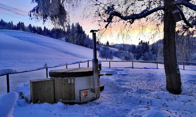 In the farmhouse built in 1707, which was renovated in 2020 according to building biology guidelines, we rent out a quiet and cosy holiday flat. The studio is ideal for two people. It is equipped with a modern kitchen, bathroom with shower/toilet and pull-out sofa. There is a radio, Internet TV and WLAN. A staircase leads to the gallery under the roof with a cosy double bed. (due to the height of the room, the bed is on the floor)In the newly designed garden you can laze around to your heart's content.as a little break from everyday life, the in-house sauna with colour light therapy can be used for a small extra charge. If you wish, we can also heat up the hot pot in the garden for you to relax in. It is equipped with massage jets and an aerator. (separate tariff / not possible in case of water shortage)We are embedded in a forest and agricultural zone. Schwellbrunn was voted the most beautiful village in Switzerland by the Swiss population in 2017. In summer, beautiful hiking trails can be explored right on the doorstep. There are plenty of bike trails and e-bike routes in the surrounding area. The Appenzellerland and the Lake Constance region offer a variety of culinary, sporting and recreational activities. There is something for everyone in the surrounding area. In winter, various snowshoe hiking trails pass close to the house. A cross-country ski trail can also be used day and night. The farmhouse is situated just outside Schwellbrunn on a private road. Direct access to the house is possible and parking spaces are available right next to the flat. The steep road, paved with Ecoraster, is not necessarily recommended for cars with long wheelbase or lowered cars. The nearest bus stop is a 30-minute walk away. By car it is 10 minutes to Herisau and 20 minutes to the city of St.Gallen or Appenzell.