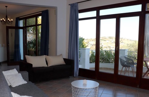 The comfortably furnished apartment AEGEAN VIEW 2, is located one floor below the maisonette AEGEAN VIEW 3. Slightly sloping, with ground-level entrance, beautiful terrace with unobstructed sea view, it is ideal for a carefree vacation by the sea with the family. The comfortable and friendly furnishings of the apartment with large balcony windows and direct exit to the beautifully designed sea-facing terrace captivates with its size. The huge living/dining room with fireplace is adjoined by the semi-open kitchen. From the kitchen there is an open, spacious storage room, which is connected to the bathroom. From the living room, a small hallway leads to both bedrooms with beautiful views of the blue Aegean Sea.