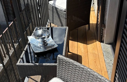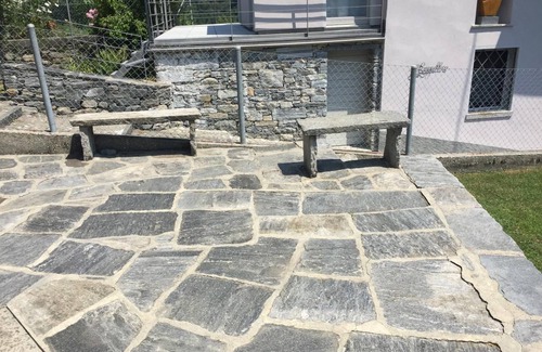 The outdoor area of the flat offers a wonderful terrace with breathtaking views of the surrounding mountains and the valley. Furnished with comfortable armchairs, cushions and a small side table, this is the perfect place to enjoy a morning coffee or a relaxed aperitif. In the garden, which is adorned with a typical granite fountain, you will find a cosy sofa, a side table and a dining table with chairs - perfect for enjoying the outdoors.