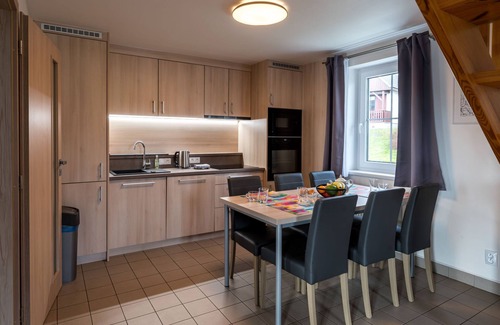 4-room house 100 m2 on 2 levels. Bright, comfortable and cosy furnishings: open living room with satellite TV. Exit to the terrace. Kitchen (oven, dishwasher, 4 induction hot plates, kettle, microwave, freezer, electric coffee machine) with dining table. Sep. WC. Upper floor: 3 rooms, each room with 2 beds. Bath/WC. Large terrace 19 m2. Terrace furniture, barbecue (portable). Facilities: washing machine, baby cot. Internet (WiFi, free). Please note: suitable for families. Non-smoking house. 1 small pet/ dog allowed.