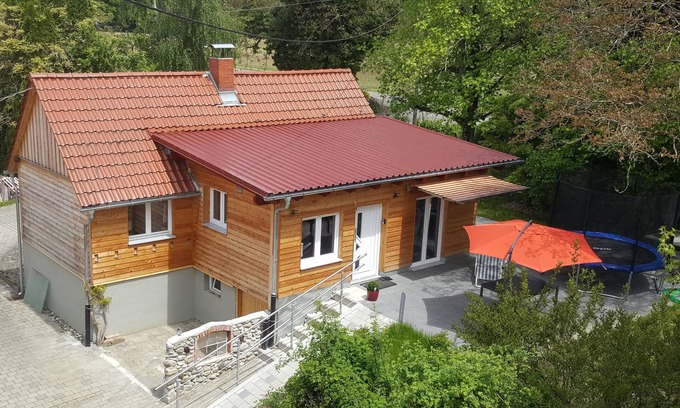 The completely barrier-free and ecologically renovated vacation home is located in the hinterland of Lake Constance in the scenic climatic health resort of Deggenhausertal. It is approx. 16 km from Lake Constance and approx. 8 km from Salem Castle Lake. The separate building has a huge terrace and a garden area surrounded by trees and bushes. The farm is part of the Winkelhof estate, which is almost completely surrounded by forest. The nearest farm is about 400 m away. The separate vacation home is part of a farm with old organic fruit trees and orchards, but is otherwise no longer actively farmed. There is room for up to 5 people in the vacation home, which consists of 2 bedrooms, a bathroom and a living room with a kitchenette.