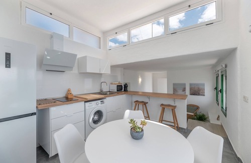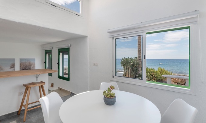 The accommodation offers stunning views of the ocean and the Los Ajaches massif, with Lobos Island on the horizon. You will have all the necessary amenities for your stay: a fully equipped kitchen, bathroom with toiletries included, free WiFi, and air conditioning.