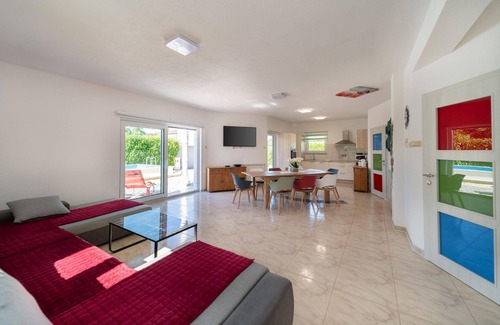 Inside, Villa Tara boasts a spacious interior with air-conditioning available throughout the property for your comfort during those warm Istrian days. The house comes equipped with 4 cozy bedrooms, ensuring a restful night's sleep for all guests. The 2 bathrooms, including a bath tub, cater to your preparation and relaxation needs. For your entertainment and convenience, a flat-screen TV is provided along with a washing machine for sole use. The kitchen is fully equipped, featuring a dishwasher, coffee machine, and an electric kettle, making meal preparation a breeze.
