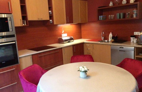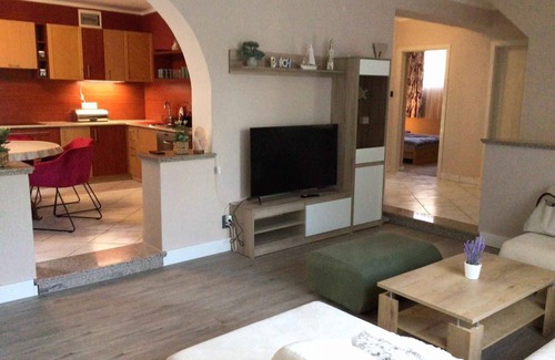 The detached holiday home built in 1987, was renovated in 2022 and is furnished in a modern style. The property is located in a holiday home settlement, in the town centre. Also due to its quiet location the domicile is popular. Available for your exclusive use: sunbathing lawn, parasol, sun lounger, barbecue facilities, terrace, garden furniture and courtyard.LocationBalatonboglár. The holiday home is located on a 400 sqm enclosed garden plot with meadow and shrubs, bordered by a fence and a hedce. The landlord lives in a separate building on the property. Access is via a side road (asphalted). Parking (for 3 cars) is available on the property. Specialair conditioning. 5 Air conditioning units in the houseFacilities: internet access (WLAN) and dryer. TV reception takes place via satellite.For your safety, the accommodation is equipped with smoke detector. Dogsnot allowed. DistancesShopping 1100 m, restaurant 850 m, town center 700 m. For a relaxing holiday, a car is not necessary. Balatonboglár: railway station 1100 m, pharmacy 700 m and bank 750 m. Railway line 800 m. Main road 700 m. Children's playground 900 m. In summer: Balaton 900 m in Balatonboglár (beach 900 m in Balatonboglár featuring meadow and sand). Balatonboglár: fishing, boat launch each 1,8 km. tennis 800 m and mini golf 900 m. dog beach in Fonyód 12 km. DivisionHoliday home, 2 floors, 7 rooms (including 5 bedrooms), 180 sqm, in total 11 beds (including 1 cot). RoomThe entrance to your holiday home is located on the ground floor and leads over 2 steps directly into the vestibule.Ground floor: Living room (20 sqm) with sitting area, TV and access to the terrace (18 sqm, garden furniture, 1 table, 8 chairs, 2 sunbeds, parasol). Bedroom (12 sqm) with 1 double bed (Kingsize) and 1 cot. All windows and external doors are secured with fly screens. Bedroom (12 sqm) with 1 double bed (Kingsize). Kitchen with dining area (6 seats), electric stove (ceramic hob, 4 plates), oven, extractor hood, dishwasher, fridge (icebox), microwave, coffee machine, toaster and electric kettle. Bathroom (5 sqm) with shower, 1 washbasin and window. Separate toilet (2 sqm) with WC. 1st floor: Living room (20 sqm) with sitting area and TV. Bedroom (12 sqm) with 1 double bed (Kingsize). Bedroom (9 sqm) with 1 double bed (Kingsize). Bedroom (15 sqm) with 1 double bed. Kitchenette (4 sqm) with electric stove (ceramic hob, 2 plates) and fridge. All windows and external doors are secured with fly screens. Bathroom (5 sqm) with shower, 1 washbasin, WC and window. All windows and external doors are secured with fly screens. Terms of lease and pricesIncluded in the priceparking place, electricity, water, bed linen, hand towels, Wireless Internet access. Side costs-Costs on the spot:/Obligatory:final cleaning 25 € per object per stay. local tax by local tariff.On request:Air conditioning - please order at booking 40 € per object per week.Deposit:EUR 150,-/object