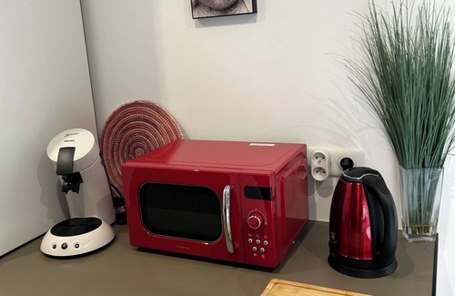 For your comfort, air conditioning is available throughout the apartment. The fully equipped kitchen includes an oven, dishwasher, kettle, fridge, freezer, and Dolce Gusto or filter coffee machine (upon request).