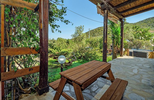 This vacation rental offers a secluded outdoor space with a garden and a covered terrace.