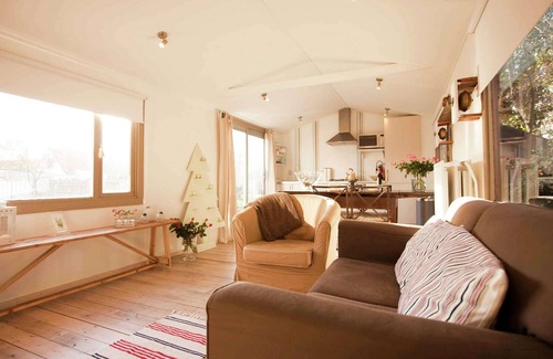 Layout: Ground floor: (Living room(double bed box, TV(flatscreen), dining table, seating area, DVD player), Kitchen(cooker(gas), coffee machine(pads), combination microwave, fridge-freezer, high chair), bedroom(double bed(two single duvets), camping cot), bathroom(shower, washbasin, toilet), washing machine, heating, terrace(private), garden(350 m2), BBQ, parking, trampoline)