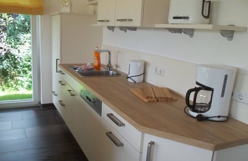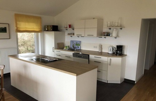 The Zur Salzwiese holiday home is a typically Nordic house with plenty of charm and coziness. The bright entrance area with vestibule leads guests into the open-plan living area with integrated kitchen. The vestibule offers ample closet space for luggage, groceries, and footwear. A washing machine is also available to our guests free of charge. The spacious living room with floor-to-ceiling windows is bright and welcoming and offers direct access to the wooden terrace with sea views and a view of the garden. The living area features a comfortable sofa, an armchair, a wood-burning stove for cozy evenings, a flat-screen TV with DVD player, a large dining area, and an open, modern kitchen. The kitchen is fully equipped with a dishwasher, stove, oven, and all necessary kitchen utensils. Free Wi-Fi is also available to our guests. The holiday home has three bedrooms. One bedroom has a double bed. Another bedroom has two single beds. The third bedroom has a single bed that can be extended to 160 x 200 centimeters using a pull-out drawer, making it ideal for two people. The spacious bathroom is equipped with a walk-in shower. A special highlight is the Finnish sauna, which is located directly in the bathroom. There is also a separate guest toilet. The terrace is equipped with garden furniture, sun loungers, a parasol, and a barbecue, perfect for relaxing outdoors. Parking spaces are located directly in front of the holiday home.