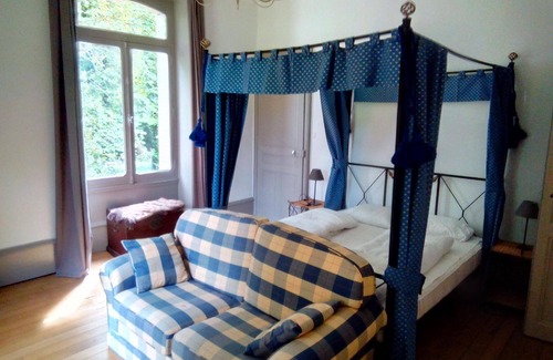 The château is surrounded by a 7.5-hectare park with mature trees and several meadows. A small river meanders through the tranquil park with many romantic corners to discover. The estate is home to two large orchards with over 170 trees, mainly old varieties of fruit. The more than 300 hydrangeas also invite you to take a stroll. During your stay, you have exclusive use of an unheated natural water pool (only in summer), which is fed by the castle's own river. Enjoy your pool water without chlorine in the middle of a fruit tree meadow. The pool area is equipped with hammocks, garden loungers, pool cushions etc. The area is for your exclusive use. The area is for your exclusive use. Pool and bath towels are available for you in the laundry room. There are also various cosy outdoor seating areas with a direct view of the park or at the front of the castle. You can park your private vehicle free of charge right next to the chateau. The chateau park is completely fenced in, so you can enjoy an undisturbed, peaceful stay here. A table tennis court and a barbecue round off the facilities.