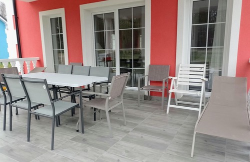 Layout: Ground floor: (Kitchen(electric kettle, boiling water tap, toaster, cooker(4 ring stoves, electric), coffee machine, espresso machine, oven, microwave, dishwasher, fridge-freezer), Living/diningroom(TV(satellite, german television channels), dining table, decorative fireplace, seating area), bedroom(single bed, single bed), bathroom(shower, washbasin, toilet, washing machine)) On the 1st floor: (bedroom(double king size bed), bedroom(double king size bed), bedroom(single bed, single bed), bedroom(single bed, single bed), bathroom(shower, washbasin, toilet)) terrace(roofed), garden(private), garden furniture, BBQ