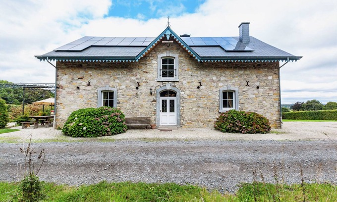 This cosy holiday home is a former stable that has been stylishly renovated into a luxury residence and is perfect for a group of 13. It is located in a peaceful area, 460 m above sea level on a gorgeous private property in Saint-Hubert and has 5 bedrooms. A sauna is in place for you to give maximum relaxation. The holiday home is situated near a lovely forest and you can go fishing for trout in a nearby private lake for a fee. There are tons of hiking and (mountain) biking trails in the region. Within 6 km from the home, you can find a restaurant and grocery store. In the spacious and nicely decorated living area, you'll find a cosy open fireplace. The completely furnished open kitchen with attached dining area has a homely, intimate feel and contains a dining table. The garden offers access to a large terrace with a barbecue where you can enjoy a panoramic view of the hilly surroundings. The home also has a trampoline, and sandpit for the kids.