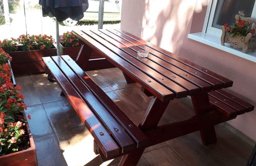 The detached holiday home was renovated in 2019 and is furnished in a modern style. The property is located in a residential area, in the town centre. Also due to its quiet and sunny location the domicile is popular. Available for your exclusive use: children's playground, swing, sandpit, climbing frame, terrace, garden furniture and courtyard.LocationBalatonmáriafürdő. The holiday home is located on a 200 sqm enclosed garden plot with flowers, bordered by a fence. The landlord does not live in the house or on the property. Access is via a side road (asphalted). Parking (for 2 cars) is available on the property. Specialair conditioning.Facilities: washing machine. TV reception takes place via satellite.For your safety, the accommodation is equipped with smoke detector. Dogsallowed, EUR 5.00/pet per day. DistancesShopping 200 m, restaurant 300 m, town center 10 m. In summer: Balaton 400 m in Balatonmáriafürdő (beach 400 m in Balatonmáriafürdő featuring meadow). DivisionHoliday home, 2 floors, 4 rooms (including 4 bedrooms), 100 sqm, in total 9 beds (including 1 additional bed). RoomThe entrance to your holiday home is located on the ground floor, is at ground level and leads over the terrace.Ground floor: Bedroom with 2 single beds. Bedroom with 1 double bed. Kitchen with dining area, gas stove (4 flames), oven, dishwasher, fridge (icebox), microwave, coffee machine and fireplace. Bathroom with bathtub with shower facility, 1 washbasin and WC. Upper floor: Bedroom with 1 double bed and 1 additional bed. Bedroom with 1 double bed. Kitchenette with dining area and Air conditioner. Bathroom with washing machine, shower, 1 washbasin and WC. Terms of lease and pricesIncluded in the priceparking place, electricity, water, final cleaning, bed linen. Side costs-Costs on the spot:/Obligatory:local tax by local tariff.On request:air conditioning 50 € per object per week.Deposit:EUR 200,-/object.