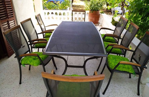 The detached holiday home built in 2000 and is a semi-detached house and furnished in a functional and typical country style. The property is located in a residential area, in the town centre. Also due to the view over the sea from the property and its quiet and sunny location the domicile is popular. Available for shared use: parasol, garden shower, barbecue facilities, terrace and garden furniture.LocationVrsi, 5 m above sea level. The holiday home is located on a 600 sqm open garden plot with flowers and shrubs. The landlord lives permanently in the house, but uses a seperate entrance. Access is via a side road (asphalted, length 70 m). Parking (for 6 cars) is available on the property and on the street in front of the house. SpecialThere is no heating.Facilities: baby cot, internet access (WLAN) and iron. TV reception takes place via satellite. Dogsallowed. Free of charge. DistancesShopping 250 m, restaurant 50 m, town center 2 km. Vrsi: doctor 2,2 km and pharmacy 2,3 km. bank in Zadar 25 km. airport in Zemunik-Zadar 35 km. Main road 70 m. Children's playground 80 m. Highway A1 - 28500 m In summer: Adriatic coast 80 m in Vrsi Mulo (beach 80 m in Vrsi Mulo featuring gravel). Heilschlamm in Nin 8 km. DivisionHoliday home, 2 floors, 4 rooms (including 4 bedrooms), 160 sqm, in total 8 beds, on request additionally 1 child up to 2 years in a baby cot. RoomThe entrance to your holiday home is located on the ground floor and leads over 1 step and the 33 sqm terrace directly into the hallway.Ground floor: Kitchen (7 sqm) with gas stove (3 flames), oven, extractor hood, fridge (200 l, icebox), coffee machine, toaster, electric kettle and access to the terrace. 1st floor: Bedroom (13 sqm) with 1 double bed and access to the balcony (4 sqm). Bedroom (15 sqm) with 1 double bed, 1 baby cot and access to the balcony (5 sqm). Bedroom (11 sqm) with 2 single beds. Bedroom (13 sqm) with 2 single beds and access to the balcony (5 sqm). Bathroom (4 sqm, not heatable) with shower, 1 washbasin, WC, bidet and window. Bathroom (6 sqm, not heatable) with bathtub, washing machine, 1 washbasin, WC, bidet and window. Terms of lease and pricesIncluded in the priceinternet access, baby cot, parking place, washing machine, electricity, gas, water, final cleaning, Welcome drink, Bed linen (weekly change), hand towels (weekly change), Wireless Internet access. Side costs-Additionally(Payable when booking)/local tax.Deposit:No deposit.