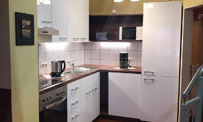 Cosy holiday home with three toilets, equipped kitchen, small terrace with garden area, can also be fenced in for our four-legged guests, two separate bedrooms, own parking space, small wood-burning stove