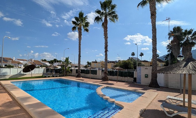Casa Isabel is a tastefully furnished holiday home of about 80 m² for up to 4 people, welcoming you in El Verger. The recently modernized terraced house offers a spacious living and dining area with an adjoining kitchen, a storage room, one bedroom, and a bathroom on the ground floor. The second bedroom with Smart TV and private bathroom is located upstairs. Both bathrooms are equipped with a shower, washbasin, and toilet. All living and sleeping rooms have modern air conditioning for cooling and heating. Bed linen and towels are included in the rental price. The open, fully equipped kitchen features a dishwasher, washing machine, fridge-freezer, induction hob, electric oven, coffee machines, toaster, and other accessories. In the living room, you have a Smart TV and a desk at your disposal. The Smart TVs receive German and Spanish channels. All windows are fitted with insect screens and shutters. Electricity and Wi-Fi are included in the price. Enjoy the private terraces on both levels with garden furniture and a barbecue. The west terrace offers a view of the Sierra de Segaria and beautiful sunsets. The large communal pool (approx. 14 x 8 m) is in a secured area at the end of the complex and invites you to relax. A parking space is available directly at the house, with further parking on the street. Events on the property are not permitted. Security cameras are present but deactivated during your stay. The house is in a quiet residential area, only about 680 meters from the sea and beach. Supermarkets, bars, and restaurants can be reached within minutes. The town of Denia with a modern marina and cultural attractions is only a few kilometers away. Several golf courses are nearby.