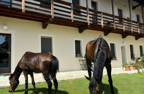 Step outside to enjoy the shared garden, where you can relax surrounded by flowers and interact with charming animals during your stay. The property is immersed in nature within Ticino Park, offering extreme tranquility away from city chaos.