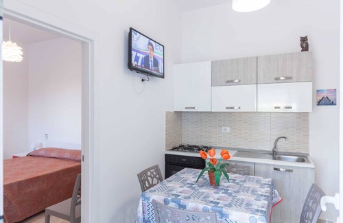 The holiday home Luna Rossa Salento - Casa Rossa is located in Porto Cesareo and boasts a beautiful view of the sea. The 50 m² property consists of a living room, a well-equipped kitchen, 2 bedrooms and 2 bathrooms and can therefore accommodate 6 people. Additional amenities include high-speed Wi-Fi with a dedicated workspace for home office, air conditioning, heating, a washing machine as well as a TV. A baby cot and a high chair are also available (please request in advance).