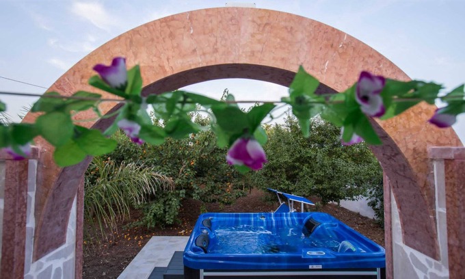 The holiday home boasts a private outdoor area with a jacuzzi, a garden, an open terrace, a covered terrace, a barbecue, a playground and an outdoor shower.
