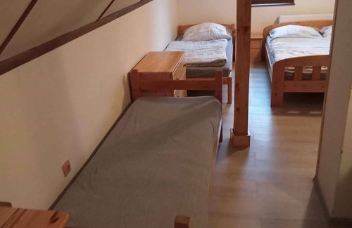 The standig individually holiday home is functional furnished. The property is located at the end of a dead end, on the outskirts. The domicile is also popular because of the view over the mountains from the property and the quiet and sunny hillside location at the edge of the woods. For exclusive use are available: sunbathing area, parasol, children's playground, swing, garden shower, grill possibility, terrace, garden furniture and fire place. 2 terraces are available, one of them covered. Outdoor gas grill.Holiday resort20 accommodations and 22 beds. A cot LocationVítkovice v Krkonoších, district Levínek, 750 m above sea level. The holiday home is located on a 10000 sqm, open garden plot with meadow, bushes and trees. The landlord does not live in the house or on the property. Family house in the village of Vítkovice in the Giant Mountains and the road goes only through the village of Benecko. The access goes via a side road or via a field or forest path or via a mountain road (asphalted, rubble or gravel, unpaved, length 1500 m). In winter there are snow chains essential. Parking lot (for 6 cars) on the property and a parking lot in the village (distance 100 m). Parking in winter 100m from the house. The paved access road (1,5 km) runs through the village Benecko (100 m of the road are unpaved). Specialcentral heating (wood / coal), electric heating. It is also possible to use two chimneys Facilities: cot, internet access (WLAN), iron and washing machine. TV reception takes place via antenna, satellite. Dogsallowed, CZK 100.00/pet per day. DistancesShopping opportunity 1500 m (in the winter 1500 m), restaurant 1500 m, town center 1500 m. indoor swimming pool, pharmacy, bank each 10 km in Vrchlabi. Vítkovice: discotheque, cinema, doctor each 10 km. airport 12 km and sauna 1500 m. Railway line 10 km. Main road 1500 m. Center Benecko with Bowling and Wellness 1500 m. Supermarket in Vrchlabi 12 km away.In summer: horse riding in Janova mountain 3,5 km. tennis, water sports each 10 km in Vítkovice. The area offers many hiking and cycling trails. Aqua park and toboggan run in Spindleruv Mlyn 22 km away.In the winter: Ski lift 1500 m in Vítkovice. Ski area 1500 m in Vítkovice. Ski bus 1500 m. sledge slope in Špindlerův Mlýn 24 km. Vítkovice: trail 1000 m, ice skating 10 km and ski rental, ski school each 1500 m. Other ski areas nearby: Herlikovice 14 km, Špindlerův Mlýn 24 km, Kněžice-Vrchlabí 8 km. DivisionHoliday home, 2 floors, 8 rooms (including 7 bed rooms), 200 sqm, in total 20 beds (including 1 cot). RoomThe entrance in your holiday home is located on the ground floor, is covered and at ground level and leads directly in the vestibule with wardrobe.Ground floor: Common room (46 sqm, walk-through room) with sitting area, TV, tiled stove, DVD and dining area (22 seats). Bedroom (12 sqm) with 2 single beds. Bedroom (14 sqm) with 2 single beds. Cooking nook in the dining room (11 sqm, walk-through room) with electric stove (ceramic hob), oven, extractor hood, dishwasher, fridge (icebox), microwave, coffee machine, toaster and electric kettle. Anteroom (24 sqm). Anteroom (18 sqm). Cellar (10 sqm, not heatable). Bathroom with shower, 1 sink and hairdryer. Bathroom with shower and 1 sink. 2 Separate toilet each with WC. Upper floor: Bedroom (12 sqm) with 2 single beds, sitting area and access to the balcony (9 sqm, covered). Bedroom (30 sqm) with 1 double bed, 2 single beds and sitting area. Bedroom (42 sqm) with 1 double bed, 3 single beds and sitting area. Bedroom (16 sqm) with 1 double bed and 1 single bed. Bedroom (20 sqm) with 1 double bed, 2 single beds, 1 bunk bed, sitting area and access to the balcony (9 sqm, covered). Bathroom with shower and 1 sink. Separate toilet with WC. Terms of lease and pricesIncluded in the priceinternet access, parking place, washing machine, water, final cleaning, bed linen, Wireless Internet access. Side costs-Additionally(Payable when booking)/local tax.Costs on the spot:/Obligatory:electricity 0,50 € per kilowatt hour based on usage. hand towels to bring along.On request: For a fee: baby cot.Deposit:EUR 150,-/object
