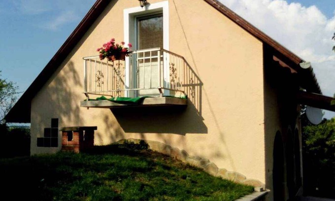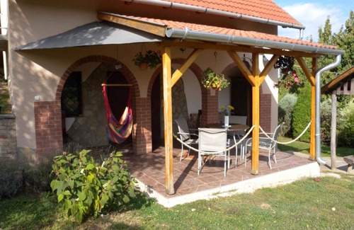 The detached holiday home was renovated in 2016 and is furnished in a rustic style. The property is located on the outskirts. Also due to the view over woods from the property and its quiet and sunny location the domicile is popular. Available for your exclusive use: parasol, sun lounger, barbecue facilities, terrace, pavilion, garden furniture, campfire site and courtyard.LocationBalatonendred. The holiday home is located on a open garden plot with meadow, flowers, shrubs and trees. The landlord does not live in the house or on the property. Access is directly from the main road (asphalted). Parking (for 2 cars) is available on the property. Specialair conditioning. There is no heating.Facilities: internet access (WLAN). TV reception takes place via satellite. Dogsnot allowed. DistancesShopping 500 m, restaurant 4 km, town center 1000 m. railway station in Zamárdi 4 km. In summer: Balaton 5 km in Zamárdi (beach 5 km in Zamárdi featuring meadow). fishing in Balatonendred 1200 m. Soccer field, fishing pond and game park in Balatonendréd DivisionHoliday home, 2 floors, 3 rooms (including 2 bedrooms), 50 sqm, in total 5 beds (including 1 additional bed). RoomThe entrance to your holiday home is located on the ground floor, is at ground level and leads over the 18 sqm terrace directly into the living & bedroom.Ground floor: Living/bedroom with 1 additional bed on sleeping accommodation, sitting area and TV. Kitchen with dining area (5 seats), gas stove (3 flames), fridge (icebox), microwave and coffee machine. Bathroom with shower, 1 washbasin and WC. Upper floor: 2 bedrooms each with 2 single beds. Terms of lease and pricesIncluded in the priceinternet access, air conditioning, parking place, electricity, water, final cleaning, sunloungers, bed linen (first usage), Wireless Internet access. Side costs-Costs on the spot:/Obligatory:local tax by local tariff.Deposit:EUR 150,-/object