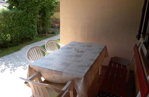 The holiday home built in 1990 and is a terraced house and furnished in a functional style. The property is located in a holiday home settlement. Also due to its quiet and sunny location the domicile is popular. Available for shared use: sunbathing lawn and Hollywood swing.LocationBalatonfenyves. The holiday home is located on a 500 sqm enclosed garden plot with meadow, flowers, shrubs and trees, bordered by a fence. The landlord lives in a separate building on the property. On the property there are 3 Holiday Flats of the same type (BAL FEN 030). Access is via a side road (asphalted). Parking (for 3 cars) is available on the property. SpecialFacilities: internet access (WLAN). TV reception takes place via satellite. Leisure3 bicycles. Dogsnot allowed. DistancesShopping 500 m, restaurant 400 m, town center 1500 m. railway station in Balatonfenyves 600 m. thermal bath in Héviz 25 km. indoor swimming pool, sauna each 15 km in Marcali. Railway line 70 m. In summer: Balaton 500 m in Balatonfenyves. fishing in Balatonfenyves 500 m. DivisionHoliday home, 2 floors, 2 rooms (including 1 bedroom), 34 sqm, in total 3 beds. RoomThe entrance to your holiday home leads over 2 steps and the 8 sqm terrace.Ground floor: Living room with 1 additional bed on couch/sofa, sitting area, TV and access to the terrace (garden furniture). Cooking nook with electric stove, fridge (icebox), microwave, coffee machine and electric kettle. Upper floor: Bedroom with 1 double bed. Bathroom with shower, 1 washbasin, WC and window. Terms of lease and pricesIncluded in the priceinternet access, parking place, electricity, gas, water, bed linen, Wireless Internet access. Side costs-Costs on the spot:/Obligatory:final cleaning 25 € per object per stay. local tax by local tariff.On request:bicycle 8 € per bicycle per day.Deposit:EUR 50,-/object.