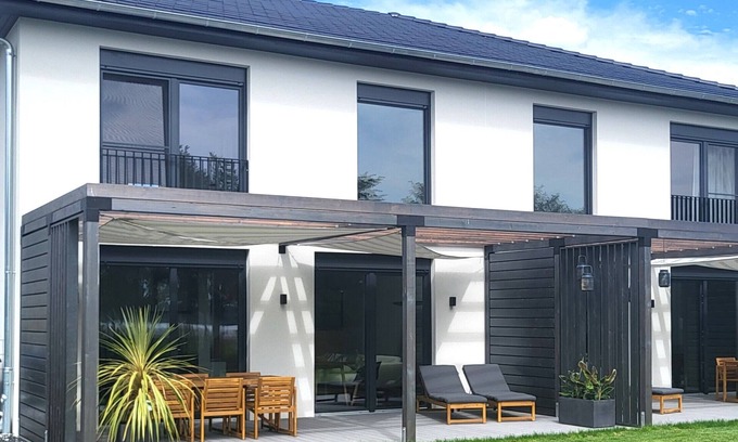 Our holiday homes are located directly on the shore of Lake Goitzsche – centrally in the village of Pouch and yet quiet, without through traffic. The location is ideal for long walks, varied cycling tours or various water sports. The newly built, modern semi-detached house (ready in 2025) offers a large garden and is situated by one of Germany’s most beautiful lakes, separated from the shore only by a foot and cycle path. The architect-designed house offers a unique living experience: a light-flooded living area with a striking, six-metre-high exposed concrete wall awaits you. An open staircase connects the living areas with the stylish bedrooms upstairs. From the gallery, you enjoy a fascinating view over the open living area to the garden and the lake. On the ground floor, there is the open living room with dining area and kitchen. Upstairs, you will find two bedrooms as well as a large, modern bathroom with freestanding tub and walk-in shower. On the cosy gallery, a comfortable sofa bed for up to two more people is available. The fully equipped kitchen and the spacious south-facing sun terrace with lake view complete the offer. Do you need a third bedroom or want to accommodate up to eight people? Simply book Apartment 8b as well, which is on the ground floor and can be connected to the house. Free parking, Wi-Fi, bed linen, hand and bath towels are included. A supermarket with bakery is within walking distance. A free parking space for boats is available on the property, and a public slipway is about 100 metres away.