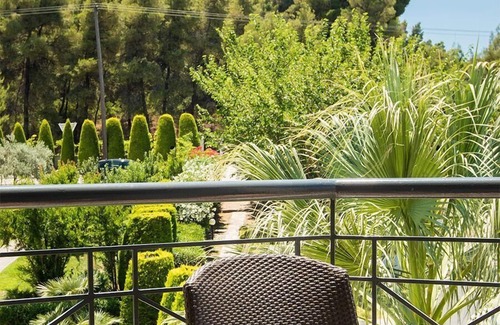 A park-like garden welcomes you with spacious grassy areas as well as cypresses, shrubs and palm trees. A large pergola and an outdoor barbecue invite you to eat and enjoy al fresco dining. Enjoy the beautiful weather on the communal terrace. The terrace is equipped with garden furniture, parasol and some garden loungers. The view of Mount Athos and the whole of Halkidiki is indescribable. The property is fenced. Enjoy the surroundings, the view of the garden and the beautiful weather on your own balcony with garden furniture.