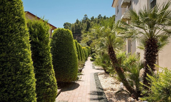 You are in a place where you can enjoy the sea breeze and the best Mediterranean climate. With private access to the beach, direct location to the crystal-clear bay with sunrises and sunsets, surrounded by idyllic countryside and several cycling and hiking trails. The ideal retreat from the hustle and bustle of modern life. Would you prefer to enjoy nature rather than water sports such as water skiing or windsurfing? You can still have a wonderful time in the area surrounding your accommodation, mountain biking, cycling tours, hiking, golf, mini golf, bowling, and so on. In general, you can see, hear, smell, taste and feel Greek culture in Halkidiki. When travelling around the peninsula, you can hardly get enough of the visual attractions that the natural landscape has to offer. Green pine forests alternate with golden flat sandy beaches, green meadows with olive and pistachio trees, steep coasts with extensive vineyards. You will be accompanied by the scent of herbs from the lush vegetation, birdsong and fresh, iodised sea air. For history buffs, there are also numerous museums, archaeological sites and artefacts to explore to familiarise you with ancient Greek culture. Take a trip to Kassandra, where the traditional market takes place, to Meteora, to the Pella theatre and open-air concert, to the ancient archaeological site of Olynthos or to the famous cave in Petralona. Athitos, a newly awakened, traditional stone-built village with cobbled alleys and marvellous panoramic spots and bathing bays, is also worth a visit. The town centre is approx. 700 m away on foot for shopping facilities.