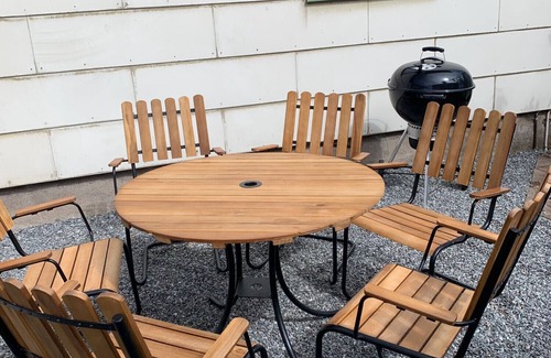 Guests have their own furnished patio with barbecue in a sunny and sheltered location. Two minutes walk to the center, swimming and Norra Hamnen's popular restaurants. Free parking nearby.