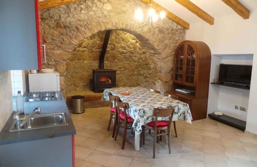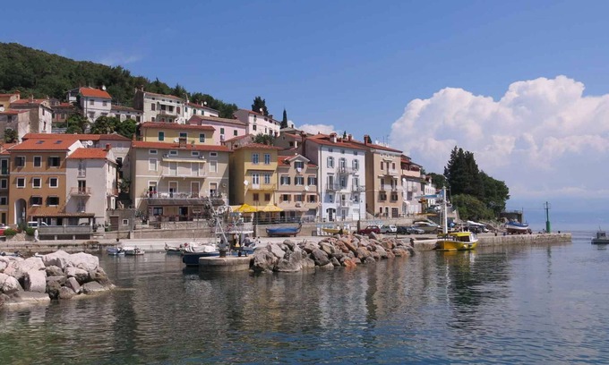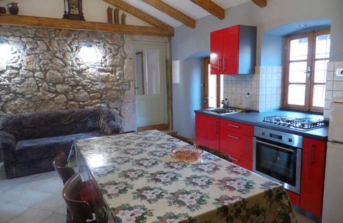 The holiday home is a townhouse and in the typical country style furnished. The property is located at the end of a dead end, on a farm, on the outskirts. The domicile is also popular because of the view over the sea from the property and the quiet and sunny hillside location. For use are available: grill possibility, terrace and garden furniture.LocationMošćenička Draga, district Kalac. The holiday home is located on a farm, on a 1000 sqm, open garden plot with meadow, flowers and trees. The landlord does not live in the house or on the property. Village cats live in the area. The access goes via a side road (rubble or gravel, length 50 m). Parking lot (for 1 car) on the property. SpecialFacilities: internet access (WLAN) and washing machine. TV reception takes place via satellite. Dogsnot allowed. DistancesShopping opportunity 3 km, restaurant 3 km, town center 3 km. indoor swimming pool, sauna each 6 km in Mošćenice. discotheque in Opatija 21 km.In summer: Adriatic Sea 6 km in Mošćenice (beach 6 km in Mošćenice with stones, rocks and bathing plateaus). mini golf in Medveja 9 km. tennis, fishing, diving, boat rental, boat launch each 6 km in Mošćenice. DivisionHoliday home, 2 floors, 3 rooms (including 2 bed rooms), 70 sqm, in total 4 beds. RoomThe entrance in your holiday home is located on the ground floor, is at ground level and leads directly in the aat-in kitchen with sitting area.Ground floor: Living room with sitting area, TV, fireplace, dining area, access to the terrace and sea view. Bedroom with 1 double bed and TV. Cooking nook in the living room with TV, gas stove (3 flames), oven, fridge (icebox), coffee machine, toaster and electric kettle. Bathroom with washing machine, shower, 1 sink, WC and window. 1st floor: Bedroom with 1 double bed and TV. Terms of lease and pricesIncluded in the priceparking place, electricity, gas, water, final cleaning, Bed linen (weekly change), Wireless Internet access. Side costs-Additionally(Payable when booking)/local tax.Deposit:EUR 100,-/object
