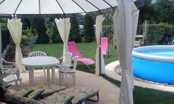 Holiday home with beautiful garden is located in Balatonboglar. Holiday home with beautiful garden provides accommodation, featuring Pool, TV, Balcony/Terrace, among other amenities. This House features Pool, TV, Balcony/Terrace, to make your stay a comfortable one.