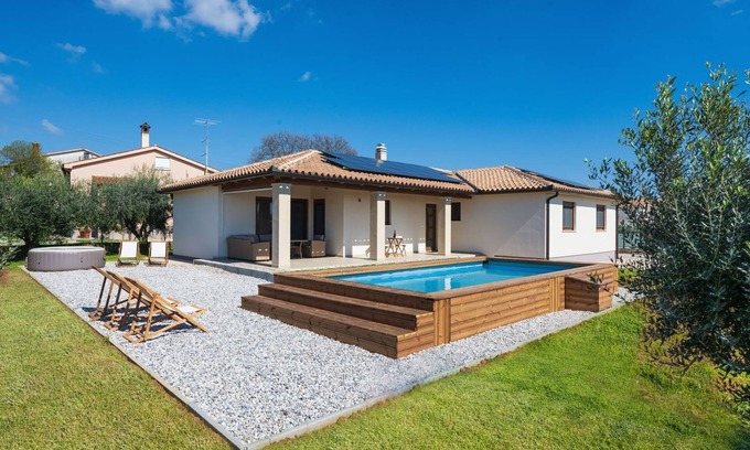 This beautiful detached holiday home in Valtura can accommodate six people. It consists of three bedrooms, two bathrooms, a fully equipped kitchen and a lovely living room with access to a covered terrace. Your little ones will surely enjoy the spacious garden and swings, while the outdoor hot tub ensures complete relaxation on holiday. The holiday home is also an ideal choice for groups of friends, as it also has a tavern with billiards and a lovely fireplace, so you even have two kitchens at your disposal. Get to know the charm of southern Istria and book your holiday in this beautiful holiday home as soon as possible!