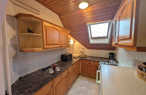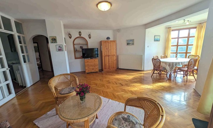 The holiday home is a semi-detached house and furnished in a modern style. The property is located at the end of a cul-de-sac road, in a residential area, on the outskirts. Also due to the view over woods from the property and its quiet and sunny location the domicile is popular. Available for your exclusive use: barbecue facilities, terrace, garden furniture and courtyard.LocationZalakaros. The holiday home is located on a 250 sqm enclosed garden plot with meadow, shrubs and trees, bordered by a fence. The landlord does not live in the house or on the property. Access is via a side road (asphalted). Parking is available in a garage and on the property. Garage can be reached through the internal staircase. Specialcentral heating (wood & coal).Facilities: internet access (WLAN). TV reception takes place via satellite.For your safety, the accommodation is equipped with CO2 detector and smoke detector. Dogsnot allowed. DistancesShopping 700 m, restaurant 700 m, town center 800 m. thermal bath in Zalakaros 700 m. Massage 700 m, wine cellar 700 m. In summer: Kis-Balaton 12 km in Balatonmagyaród (beach 700 m in Zalakaros). Ice cream shop 300 m. DivisionHoliday home, 2 floors, 5 rooms (including 3 bedrooms), 120 sqm, in total 7 beds (including 1 additional bed). RoomThe entrance to your holiday home is located on the ground floor and leads directly into the hallway.Ground floor: Bedroom with 1 double bed. All windows and external doors are secured with fly screens. Living/bedroom (34 sqm) with 1 additional bed on double sofa bed, sitting area, TV, dining area (6 seats) and access to the terrace. All windows and external doors are secured with fly screens. Kitchen (6 sqm) with gas stove (3 flames), oven, fridge (icebox), microwave, coffee machine, toaster and electric kettle. Bathroom with bathtub, shower, 1 washbasin and window. All windows and external doors are secured with fly screens. Separate toilet with 1 washbasin, WC and window. 1st floor: Dining room (16 sqm, walk-through room) with TV and dining area (6 seats). All windows and external doors are secured with fly screens. 2 bedrooms each (18 sqm) with 1 double bed. All windows and external doors are secured with fly screens. Kitchen with gas stove (3 flames), oven, fridge (icebox), microwave and coffee machine. Bathroom with shower, 1 washbasin, WC and window. Bathroom with shower, 1 washbasin, WC and Valve. Terms of lease and pricesIncluded in the priceparking place, electricity, water, final cleaning, bed linen, hand towels, Wireless Internet access. Side costs-Costs on the spot:/Obligatory:local tax by local tariff.Deposit:EUR 150,-/object