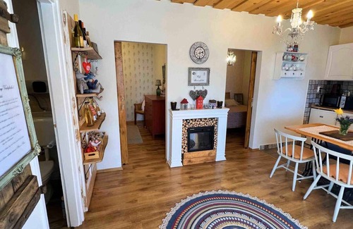 The detached holiday home was renovated in 2018 and is furnished in a modern style. The property is located in a residential area, on the outskirts. Also due to its quiet and sunny location the domicile is popular. This property is a romantic accomodation. Available for your exclusive use: sunbathing lawn, sun lounger, terrace, pavilion, garden furniture and campfire site. Use of the sauna: 2 hours daily included. In the sauna building there is a shower, separate toilet, a TV, seating and a small fridge.LocationKőröshegy. The holiday home is located on a 120 sqm enclosed garden plot with meadow, flowers, shrubs and trees, bordered by a fence. The landlord lives in a separate building on the property. The landlord has a friendly dog. The house is ideal for people who want to escape from everyday stress. The accommodation really offers rest and relaxation. Breakfast consists of various homemade dishes, such as sausage, cheese, jam, yoghurt, eggs, etc. Access is via a side road (asphalted). Parking (for 1 car) is available on the property. Specialair conditioning, electric heating.Facilities: internet access (WLAN). TV reception takes place via electric wire. WellnessSauna and whirlpool. Leisure4 bicycles. Dogsnot allowed. DistancesShopping 2,5 km, restaurant 500 m, town center 500 m. Main road 500 m. Wine tasting is possible nearby and the landlord is happy to give tips for excursions. In summer: Balaton 3 km in Szántód (beach 3 km in Szántód featuring meadow and sand). DivisionHoliday home, 1 floor, 3 rooms (including 2 bedrooms), 50 sqm, in total 6 beds (including 2 cots). RoomThe entrance to your holiday home is located on the ground floor, is covered and at ground level and leads over the 4 sqm terrace directly into the kitchen-diner with wardrobe and sitting area. 2 bedrooms each with 1 double bed. Eat-in kitchen with 2 cots, TV, fireplace and A small double pull-out couch is available. Cooking nook in the kitchen-diner with dining area (4 seats), gas stove (2 flames), fridge (icebox), microwave, coffee machine, toaster, electric kettle and access to the terrace. Bathroom with shower, 1 washbasin, WC, hairdryer and window. Terms of lease and pricesIncluded in the pricesauna, internet access, bicycle, air conditioning, parking place, whirlpool, electricity, gas, water, final cleaning, bed linen, Welcome drink, bathing towels, Wireless Internet access. Side costs-Additionally(Payable when booking)/local tax.Costs on the spot:/On request:breakfast 9 € per person per day. For a fee: sauna.Deposit:EUR 200,-/object.