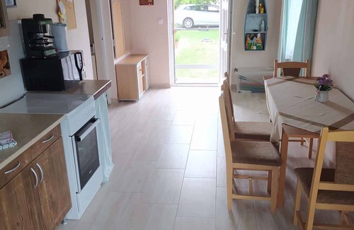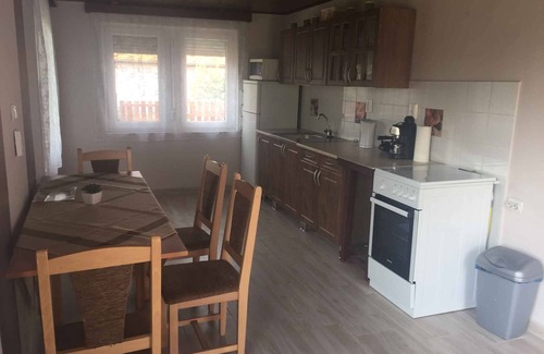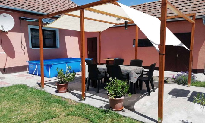 The detached holiday home is furnished in a typical country style. Also due to its quiet location the domicile is popular. Available for your exclusive use: parasol, sun lounger, children's playground, swing, garden shower, barbecue facilities, terrace, garden furniture, campfire site and courtyard. Clothes lineLocationBalatonkeresztúr, district Balatonkeresztúr. The landlord does not live in the house or on the property. Access is via a side road. Parking is available on the property and on the street in front of the house. SpecialFacilities: high chair, internet access (WLAN) and washing machine. TV reception takes place via satellite. Besides Hungarian, there is also German. PoolAll pools are available for exclusive use. Outdoor pool (usable from early June to end of August, 2 m x 3 m, depth 0,60 m). LeisureVolleyball, Fußzaun Dogsallowed, EUR 5.00/pet per day. DistancesShopping 1000 m, restaurant 500 m. pharmacy in Balatonkeresztúr 5 km. Children's playground 900 m. In summer: Balaton 900 m in Balatonkeresztúr (beach 900 m in Balatonkeresztúr). DivisionHoliday home, 1 floor, 4 rooms (including 3 bedrooms), 79 sqm, in total 6 beds. RoomThe entrance to your holiday home leads over an external staircase directly into the kitchen. Living room (walk-through room) with sitting area and TV. Bedroom with 2 single beds. 2 bedrooms each with 1 double bed. Kitchen with dining area (4 seats), gas stove, oven, fridge (icebox), microwave, coffee machine, toaster and electric kettle. Bathroom with shower, 1 washbasin, WC and window. Terms of lease and pricesIncluded in the priceOutdoor pool, internet access, washing machine, electricity, water, final cleaning, bed linen, pool, sunloungers, Wireless Internet access. Side costs-Costs on the spot:/Obligatory:local tax by local tariff.Deposit:EUR 100,-/object
