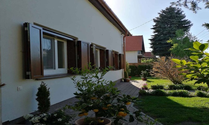 The detached holiday home built in 1989, was renovated in 2020 and is furnished in a modern and functional style. The property is located in a holiday home settlement, in the town centre. Also due to its quiet and sunny location the domicile is popular. Available for use: sunbathing lawn, parasol, sun lounger, children's playground, sandpit, barbecue facilities, terrace, garden furniture, campfire site and courtyard. Children's games, badminton and other outdoor games!LocationBalatonmáriafürdő. The holiday home is located on a 367 sqm enclosed garden plot with meadow, flowers, shrubs and trees, bordered by a fence and a hedce. The property is located in the center of the settlement, in a quiet environment! Access is via a side road (asphalted). Parking (for 1 car) is available in a carport and on the street in front of the house. There is an additional free parking in front of the house on the street Specialair conditioning, central heating (gas), electric heating. Convection gas stove + infrared panel + cooling-heating-air conditioning!Facilities: children's toys, internet access (WLAN), iron, washing machine and dryer. TV reception takes place via antenna. TV channels only in local language. NetfixFor your safety, the accommodation is equipped with CO2 detector, smoke detector and fire extinguisher. PoolAll pools are available for exclusive use. Outdoor pool (usable from mid June to mid September, diameter 3.6 m, depth 0.9 m). Leisure2 bicycles. Dogsnot allowed. DistancesShopping 200 m, restaurant 200 m, town center 200 m. Balatonmáriafürdő: bank 100 m, discotheque 200 m, railway station, doctor each 300 m. pharmacy 600 m. thermal bath in Héviz 22 km. cinema in Hévíz 22 km. indoor swimming pool, sauna each 13 km in Marcali. airport in Sármellék 15 km. Railway line 300 m. Main road 200 m. Children's playground 200 m. In summer: Balaton 300 m in Balatonmáriafürdő (beach 250 m in Balatonmáriafürdő featuring meadow). horse riding in Balatonkeresztúr 2 km. Balatonmáriafürdő: tennis, fishing each 300 m. water sports, boat launch each 800 m. golf in Batalongyörök 25 km. dog beach in Fonyód 15 km. DivisionHoliday home, 1 floor, 4 rooms (including 3 bedrooms), 110 sqm, in total 7 beds (including 1 additional bed). RoomThe entrance to your holiday home is located on the ground floor and leads over 2 steps and the 25 sqm terrace directly into the vestibule with doors to all rooms. The property has two entrances, both accessed via a patio, one patio is approximately 4m2 and the other 25m2! Step one! There are two entrances, one of which leads to the living room!Ground floor: Living room (17 sqm, walk-through room, not heatable) with sitting area, TV, fireplace, DVD player, CD player, dining area (6 seats) and access to the terrace (30 sqm, garden furniture, 1 table, 6 chairs, 2 sunbeds, parasol). All windows and external doors are secured with fly screens. Bedroom (8 sqm, not heatable) with 1 double bed. All windows and external doors are secured with fly screens. Kitchenette (6 sqm, walk-through room) with (1 flame), electric stove (ceramic hob, 4 plates), oven, extractor hood, dishwasher, fridge (180 l, icebox), microwave, coffee machine, toaster, electric kettle and access to the terrace. All windows and external doors are secured with fly screens. Bathroom (4 sqm, not heatable) with washing machine, shower, 1 washbasin, hairdryer, 2 bathrobes and window. All windows and external doors are secured with fly screens. Separate toilet with washing machine, WC and window. Upper floor: Bedroom (12 sqm, not heatable) with 2 single beds, TV, video and access to the balcony. All windows and external doors are secured with fly screens. Bedroom (17 sqm, not heatable) with 1 double bed, 1 single bed, TV, DVD player and access to the balcony. All windows and external doors are secured with fly screens. Bathroom (3 sqm, not heatable) with bathtub, 1 washbasin, 4 bathrobes and window. All windows and external doors are secured with fly screens. Separate toilet with WC. Terms of lease and pricesIncluded in the priceOutdoor pool, bicycle, air conditioning, parking place, washing machine, electricity, gas, water, final cleaning, bed linen, hand towels, pool, sunloungers, Wireless Internet access. Side costs-Costs on the spot:/Obligatory:local tax by local tariff.Deposit:EUR 200,-/object.