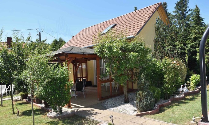 The standig individually holiday home, built in 2018 and renovated in 2020 is modern and functional furnished. The property is located at the end of a dead end, in a holiday home area, on the outskirts. The domicile is also popular because of the view over the mountains from the property and the quiet and sunny location. For exclusive use are available: sunbathing area, parasol, sun lounger, garden shower, grill possibility, terrace, pavilion, garden furniture and hollywood swing. 25 sqm covered terrace matching the holiday home. 15-minute seat massage in the house with a voucher discount. In connection with closed parking lot, separate gate entrance. The garden and the pool are also used by other guests.LocationGyenesdiás. The holiday home is located on a 900 sqm, closed garden plot with meadow, flowers and trees, limited by a fence. The landlord lives in a separate building on the property. The courtyard is a separate building with a private courtyard area with a sunbathing area and seating area. With separate gate exit. With modern, comfortable equipment. The property opens to two streets. At the entrance above there is a house where the owner lives. At the lower gate exit there is a separate small house with a garden for the guest. The whole property is also used by other guests. 500 m, quiet single-family house near Lake Balaton. With separate exit, lounge, terrace. Nice yard. The access goes via a side road (asphalted, length 100 m). Parking lot (for 4 cars) on the property. Separate entrance for cars Closed courtyard car park. Specialair conditioner. There is no heating. Facilities: internet access (WLAN), iron and dryer. TV reception takes place via satellite. The number of programs is 62, there are also programs in foreign languages. PoolOutdoor pool (3.8 m x 5.1 m, depth 1.2 m, for common use). The pool facility can be used from the beginning of June to the end of August. There are a total of three apartments sharing the pool. Leisuretable football. Dogsnot allowed. DistancesShopping opportunity 150 m, restaurant 120 m, town center 300 m. Gyenesdiás: cinema 1000 m, railway station 150 m, doctor, pharmacy each 250 m. bank 300 m. thermal bath in Hévíz 8 km. indoor swimming pool in Keszthely 5 km. Railway line 150 m. Main road 200 m. Children's playground 80 m. A túrázni vágyóknak közelben lehetőségük van, a Keszthelyi -hegységben, mely látható a teraszunkról is.In summer: Balaton 800 m in Gyenesdiás (beach 800 m in Gyenesdiás with meadow, sand and bathing plateaus). golf in Balatonederics 12 km. Gyenesdiás: tennis, mini golf each 350 m. horse riding 450 m and fishing, water sports, boat rental each 800 m. dog beach in Keszthelyen 8 km. Boat trips in Keszthely can be booked. DivisionHoliday home, 1 floor, 3 rooms (including 2 bed rooms), 55 sqm, in total 4 beds. Smoking is prohibited in the property. RoomThe entrance in your holiday home is located on the ground floor, is covered and at ground level and leads over the 55 sqm terrace directly in the porch with sitting area and doors to all rooms. Living room (not heatable) with sitting area, TV, dining area (4 seats) and access to the terrace (covered, garden furniture, 1 table, 6 chairs, 4 sunbeds, hollywood swing, parasol). Bedroom (not heatable) with 2 single beds. Bedroom (not heatable) with 1 double bed. American kitchen in the eat-in kitchen (not heatable) with dining area (4 seats), gas stove (1 flame), fridge, microwave, coffee machine, toaster, electric kettle, dryer and access to the terrace. Bathroom (not heatable) with shower, 1 sink, WC, hairdryer and window. Terms of lease and pricesIncluded in the priceOutdoor pool, internet access, parking place, electricity, gas, water, final cleaning, bed linen, pool, sunloungers, Wireless Internet access. Side costs-Costs on the spot:/Obligatory:air conditioning 7 € per object per day. local tax by local tariff.On request: For a fee: massage.Deposit:EUR 50,-/object.