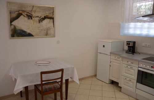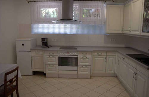 The detached holiday home built in 2006, was renovated in 2014 and is furnished in a modern and rustic style. The property is located in a residential area, in the town centre. Also due to its quiet and sunny location the domicile is popular. Available for your exclusive use: sunbathing lawn, parasol, sun lounger, barbecue facilities, terrace and garden furniture.LocationBalatonszentgyörgy. The holiday home is located on a 1000 sqm enclosed garden plot with meadow, flowers and shrubs, bordered by a fence. The landlord does not live in the house or on the property. Access is via a side road (asphalted). Parking (for 1 car) is available in a garage and on the property. Specialcentral heating (gas).Facilities: baby cot, internet access (WLAN) and washing machine. TV reception takes place via satellite.For your safety, the accommodation is equipped with smoke detector. PoolAll pools are available for exclusive use. Outdoor pool (usable from early May to end of September, 4 m x 8 m, depth 1,5 m). Dogsallowed, EUR 5.00/pet per day. DistancesShopping 500 m, restaurant 500 m, town center 500 m. discotheque in Balatonbereny 3 km. Balatonszentgyörgy: railway station 1000 m, doctor, bank each 500 m. pharmacy 800 m. thermal bath, sauna each 15 km in Heviz. cinema in Keszthely 15 km. indoor swimming pool in Marcali 15 km. airport in Zalakaros 10 km. Railway line 1000 m. Main road 500 m. Children's playground 500 m. In summer: Balaton 3 km in Balatonbereny (private beach and nudist beach featuring meadow). DivisionHoliday home, 1 floor, 4 rooms (including 3 bedrooms), 150 sqm, in total 6 beds (including 2 additional beds). RoomThe entrance to your holiday home is located on the ground floor, is at ground level and leads directly into the hallway. Living room with sitting area, TV, fireplace, dining area (6 seats) and access to the terrace (20 sqm, covered, garden furniture, 1 table, 6 chairs). Bedroom with 2 additional beds on double sofa bed. 2 bedrooms each with 1 double bed. American kitchen with electric stove (ceramic hob), oven, extractor hood, dishwasher, fridge (icebox), coffee machine and electric kettle. Storeroom. Bathroom with bathtub, shower, 2 washbasins, WC, hairdryer and window. Separate toilet with 1 washbasin and WC. Terms of lease and pricesIncluded in the priceOutdoor pool, babycot, internet access, baby cot, parking place, electricity, water, bed linen, pool, sunloungers, Wireless Internet access. Side costs-Costs on the spot:/Obligatory:final cleaning 50 € per object per stay. local tax by local tariff.Deposit:EUR 150,-/object