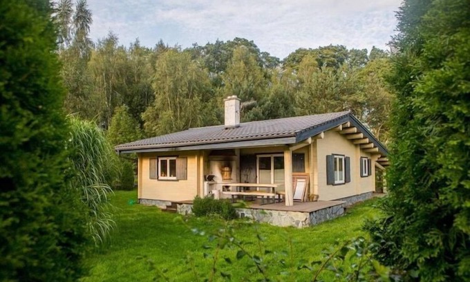 House Krąg: Area: rooms - 85 m², terrace - 20 m², carport - 35 m², plot - 1100m². Layout of rooms: corridor, two bedrooms (1 and 2), living room with fireplace, kitchen, bathroom and utility room. Bedrooms: In bedroom "1" there is a double bed, two bedside tables and a chest of drawers, a Roman blind is hung on the window. In bedroom "2" there are two single beds, a table and a wardrobe, Roman blind on the window. Living room: In the living room there is a large sofa, which when unfolded becomes a comfortable double bed, a wood stove, a table, two armchairs, a TV, music equipment, decor - paintings and accessories related to the passion for motorcycles. The living room is connected to the kitchen by a passage, from the living room there is also an exit to the terrace with a grill and to the garden, where there is a barrel and a sauna house. Kitchen: Table for max 8 people, chairs, fully equipped - four-burner hob, oven, microwave, fridge, freezer, cutlery, pots, pans, dishes, spices. Terrace: Wind-proof roller blinds, table, two benches, brick barbecue, flowers. Bathroom: Shower cubicle, bidet, washbasin, mirror, toilet. Utility room: Washbasin, toilet, washing machine. Life jackets, oars and a boat board hang in the room. Sauna house: - Sauna proper with wood stove - Space for relaxation, with a couch and a barrel of cold water to cool the body after a sauna bath - Audio tower - Essential oils - In the house there are closed deckchairs and bicycles, behind the house there is a wood storage and a place for chopping it Bathing barrel: - Bathing tub, heated by a wood stove immersed in water. For shared use with guests of Saunowisko pod Jabłonią: - Cast iron cauldron for cooking over a fire - Pier and sandy swimming area - Boat and kayaks - Bicycles